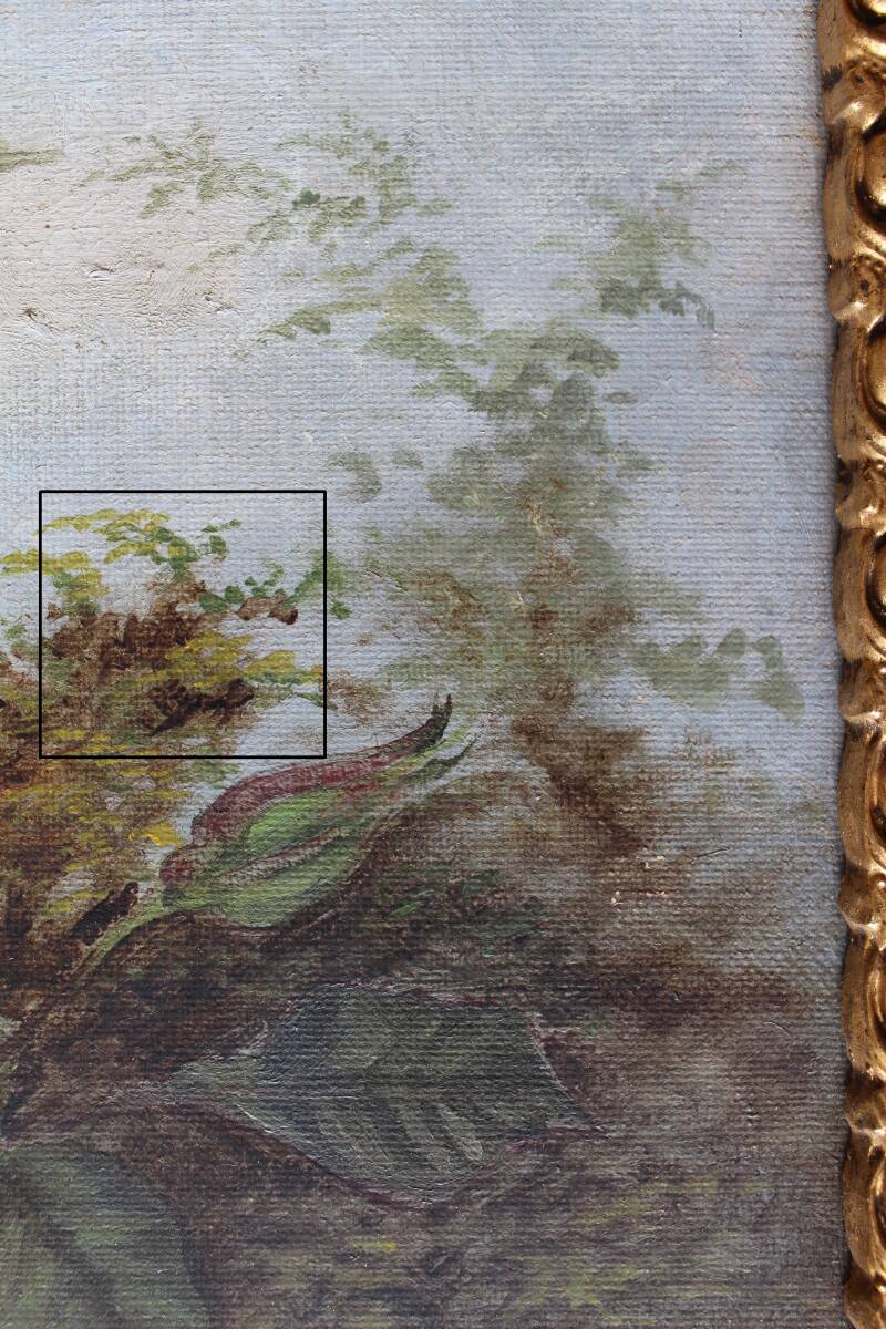 This is the section where Sarah and her cat are. The word (nee) shows up, also (Mrs) but I'm not sure of the picture that goes with it? I believe it might be a visual reference to Gen Isaac Quinbys wife since the word 'nee' is a nickname they called her (nee Gardner). You can see a chimney where smoke comes out and envelopes Sarah and her cat along with the outline of the cabin roof. I believe the 3-2 is when the painting was made, March 1862. There are two prominent three letter initials next to them but I will show them separate.